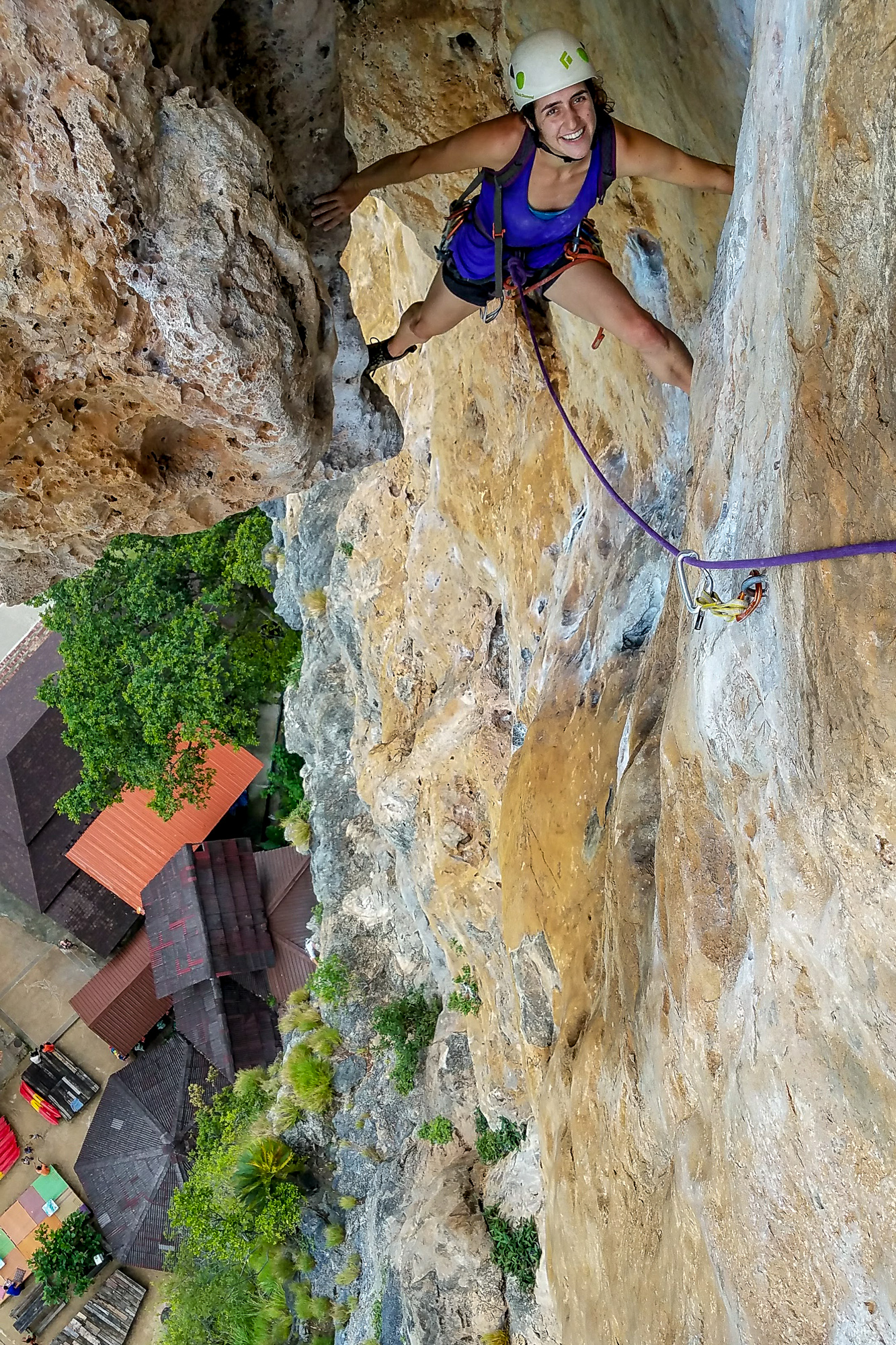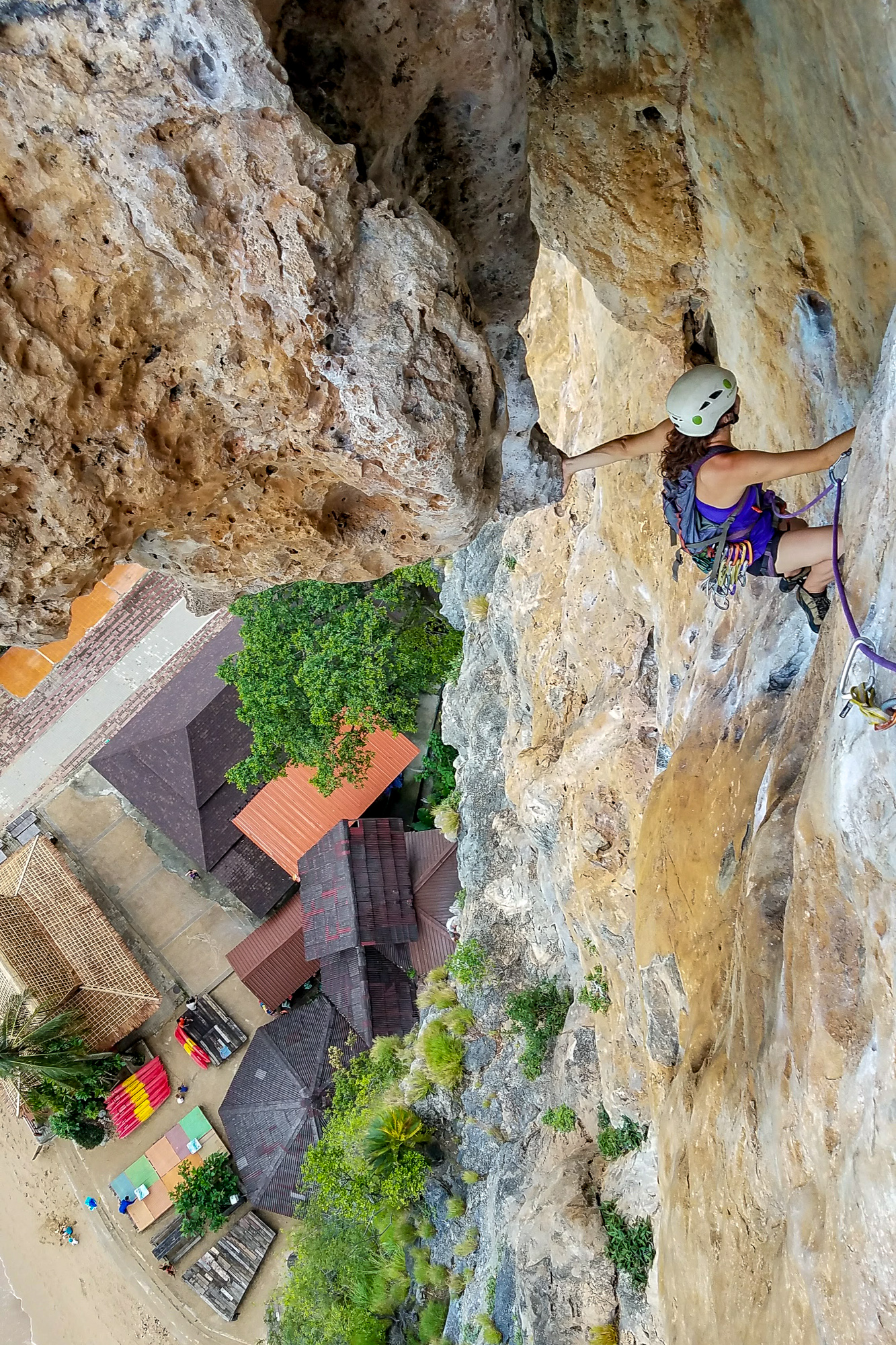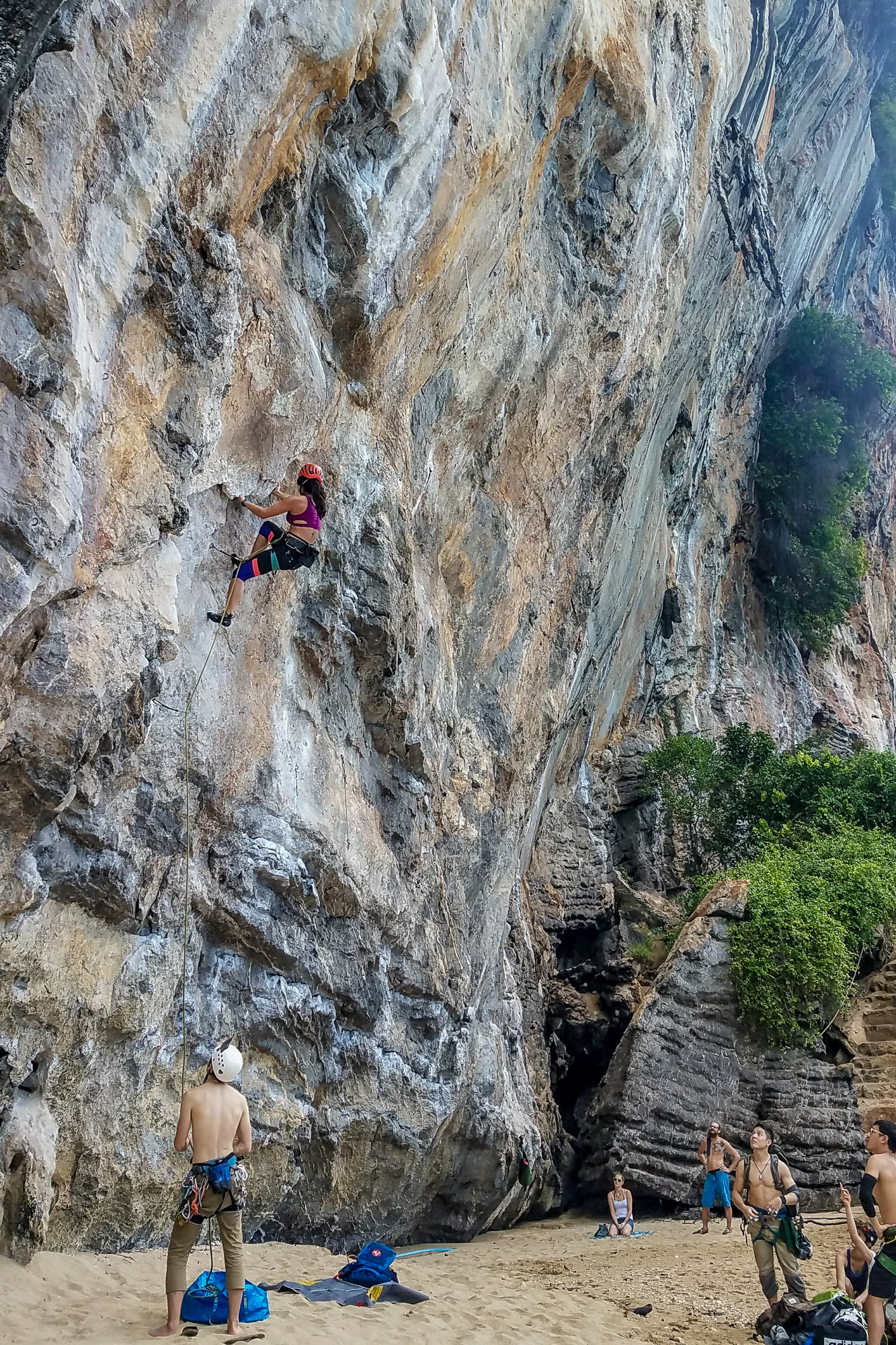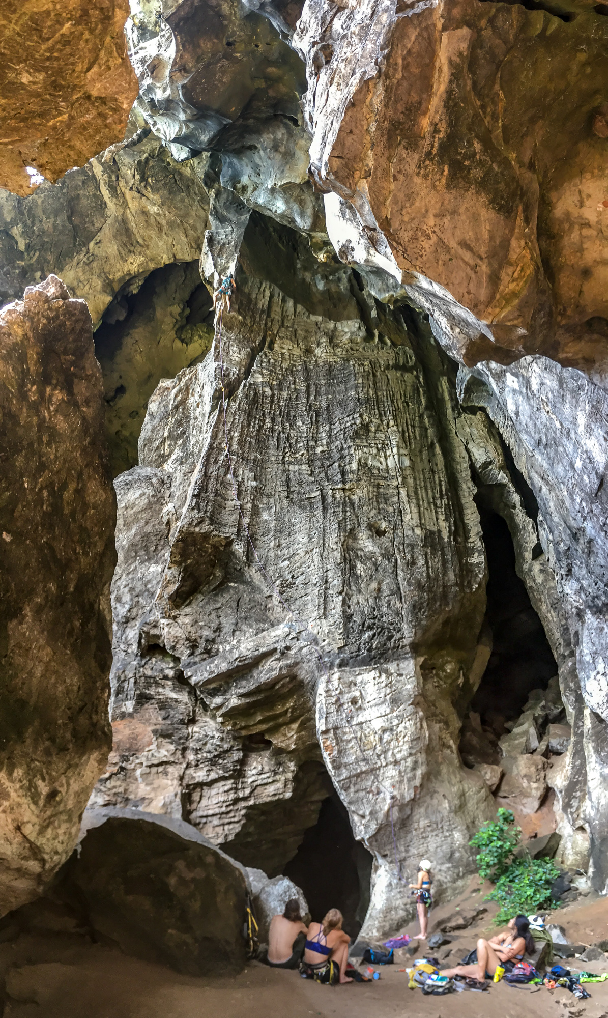 Our first climbs were on the beach, belaying with our toes in the sand. Whenever we turned, we were met with gorgeous views of the bay. We exchanged conspiratorial grins – this week was going to be awesome!On our second morning we climbed Humanality (6b+), a four pitch route at the eastern end of Tonsai beach. One move had us leaning over on to a massive tufa with nothing but air for 200 feet below! After enjoying the view at the top of the climb, we rappelled directly into the beach bar. That afternoon, we hiked to the decidedly more posh Railay, and continued through the jungle in search of a secret wall accessed by climbing through a canyon and rappelling down. By chance we recognized some rad Canadian friends from Green Climbers Home. The next day they joined us as we climbed/caved through a mountain to access one of the most beautiful climbing lines I’ve ever seen. It was so amazing that I did the climb twice, leading it clean from bottom to top on the second go.