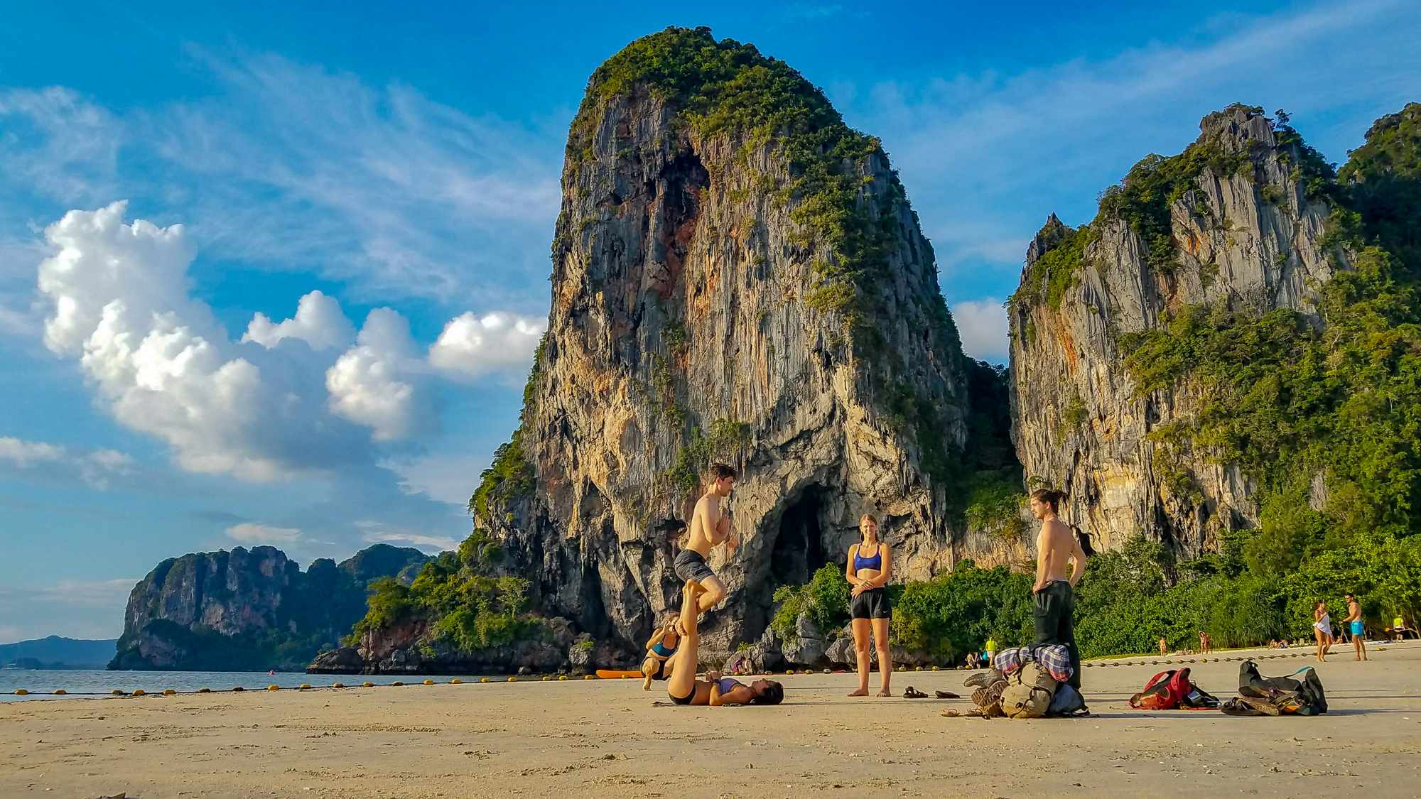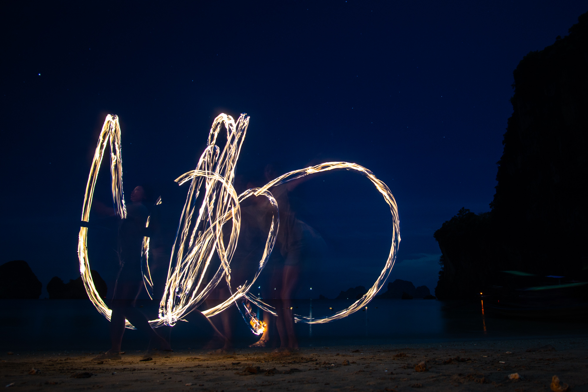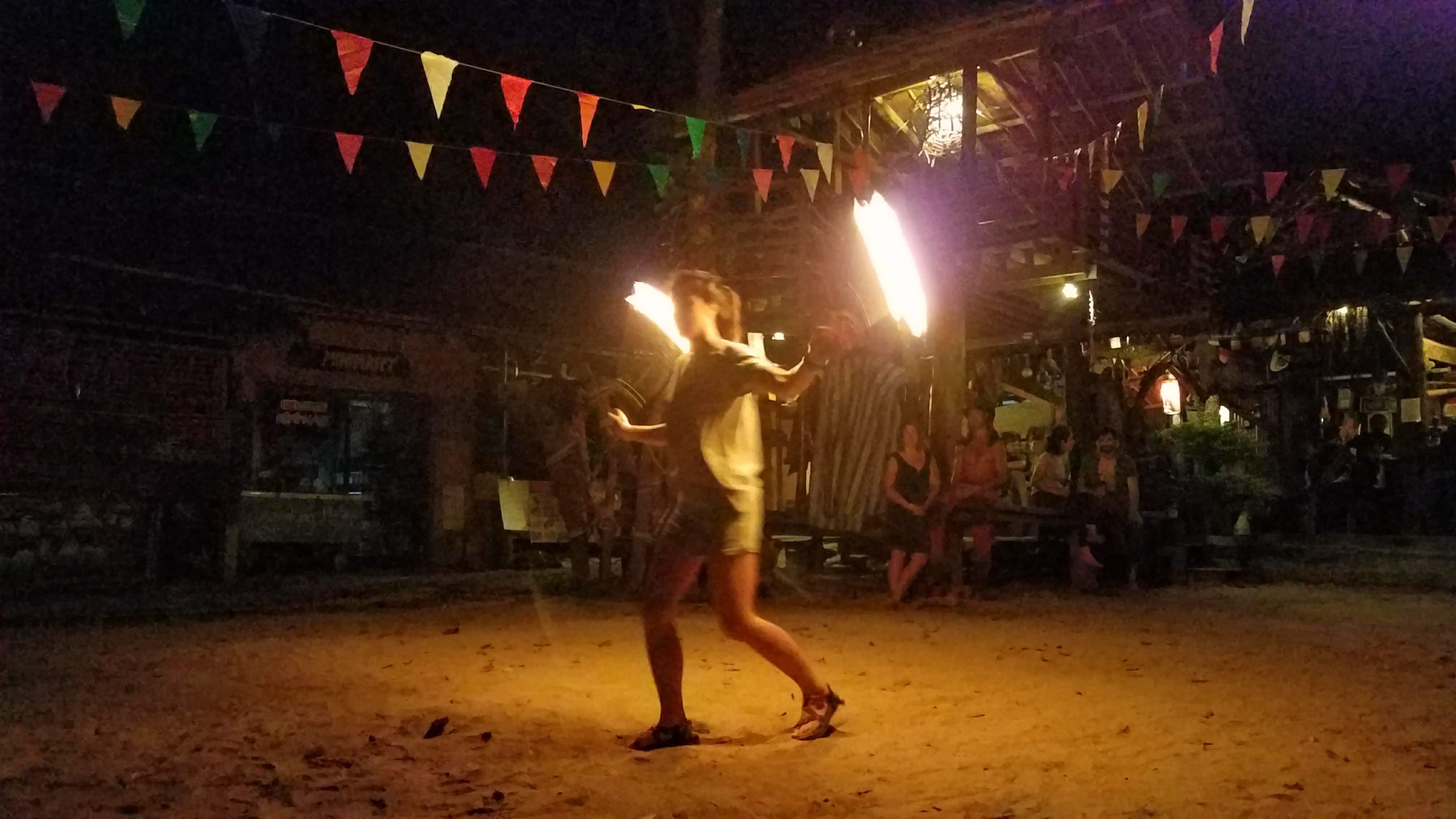 Off the wall, we practiced acro yoga on the quiet and clean Phra Nang beach. We sipped cold juice directly from coconuts. We rented kayaks and explored mini islands, secret caves, and snorkeled. We found bright corals and fish in a tiny lagoon. We crossed paths with friends we met in Vietnam! And every night, we passed out with bellies full of delicious Thai food.For Loi Krathong we released a paper lantern, filled with hot air and our wishes into the night sky. We joined a little party of climbers and locals celebrating the full moon on the beach under the stars. As krathong were floated into the bay, a local guy and Julie took turns spinning fire poi, mesmerizing us in a way only fire can.