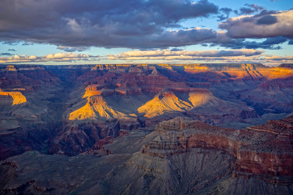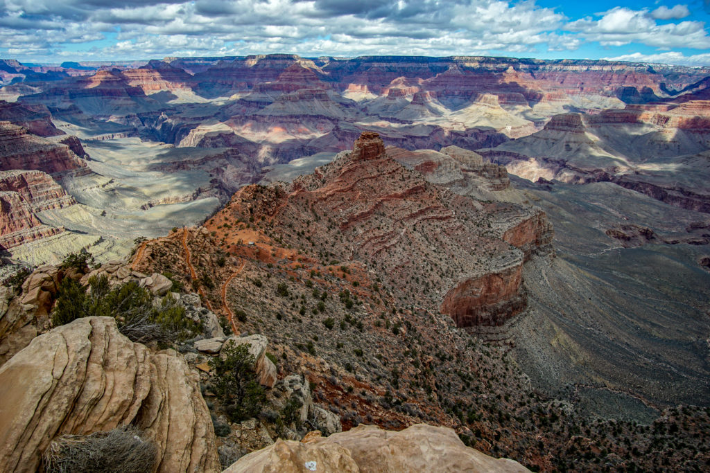 We were up early the next morning and picked a hike into the canyon. Puffy clouds overhead made the lighting super dramatic as we descended the layers. From the South Kaibab trailhead, we descended to Skeleton point, then turned around. I imagine we'll be back someday to do the full rim-to-rim trail.