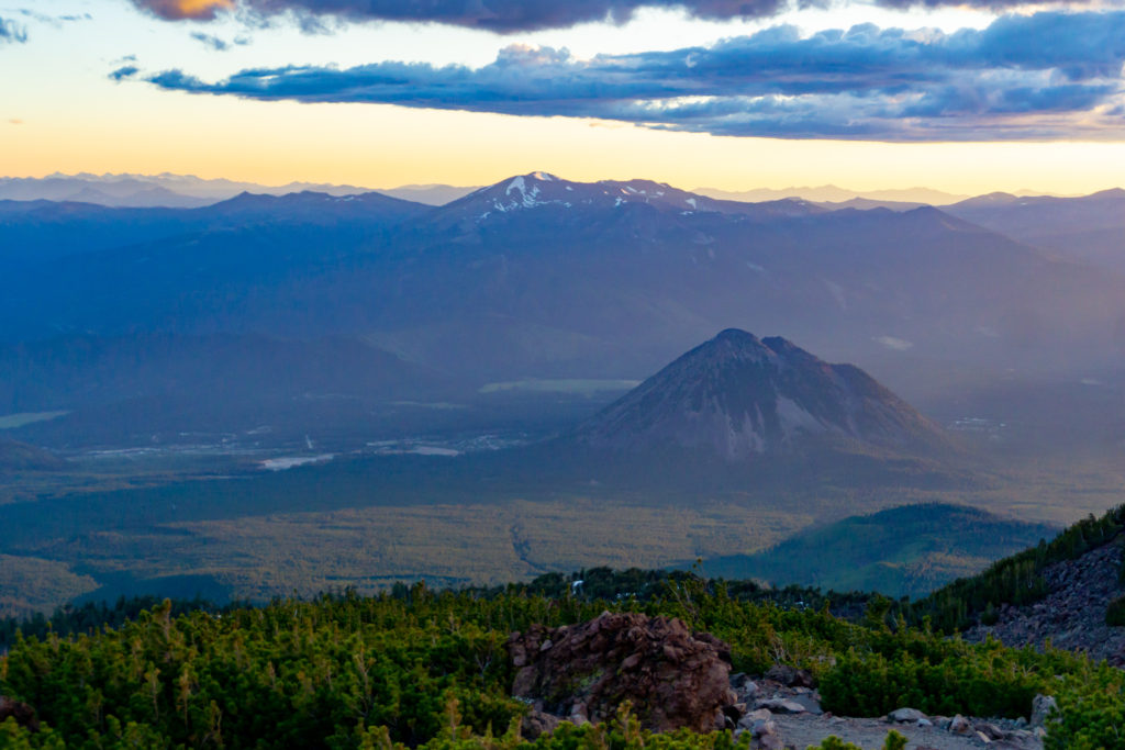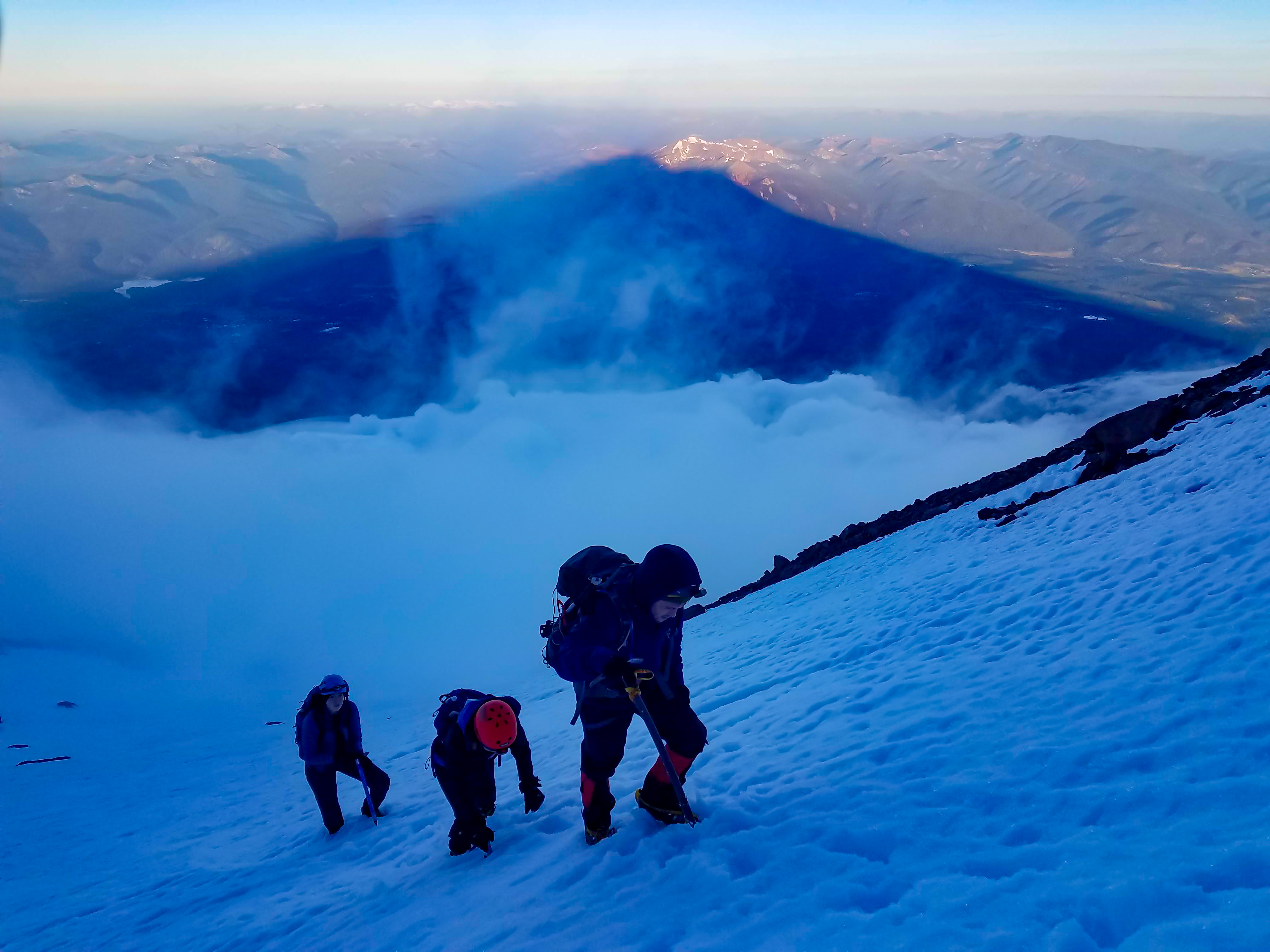 Gradually, the sky brightened and suddenly behind us was a break in the clouds. A magnificent mix of pink and orange bordered the conical shadow of Mt. Shasta. I couldn't help but to stop and stare. A moment to remind us why we're here and why we intentionally attempt these "pointless" goals. As if they understood that we needed to keep moving, the clouds closed up again and the view was gone.