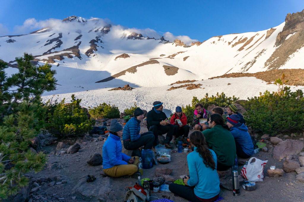 We had bagan our climb at the Bunny Flat trailhead and started towards Horse Camp. The trail climbed relentlessly and the snow had mostly melted. An hour later, we forked off towards our base camp at Hidden valley. We were prepared to camp on snow, but to our surprise there was a dry area for us to set up our tents. Day one was only 3 miles, but the 2,300 feet of elevation gain with heavy packs was tiring! We gathered water from the little stream nearby and practiced self arresting techniques before dinner. As we finished our meal, the snowy ridge facing our camp turned a bright pink as the moon rose behind it. The sun cast shadows across the valley below as we all contemplated what the next day would bring.