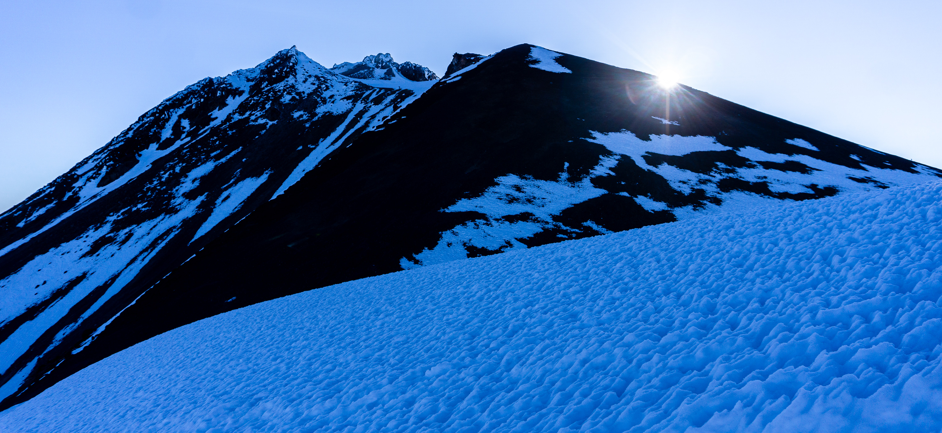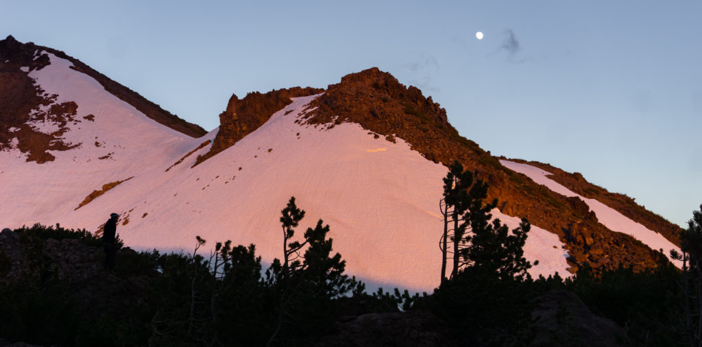 As we neared the top of the chute, with the snow at its toughest and the grade at its steepest, the morning wind picked up. Howling in our ears, it threatened to break our resolve. On the ridge, the windblown snow created a natural wall, where we escaped the wind for a moment and ate snacks. From here we could see the summit for the first time, and as we crossed the snowfield, the sun came up around the edge of Misery Hill.