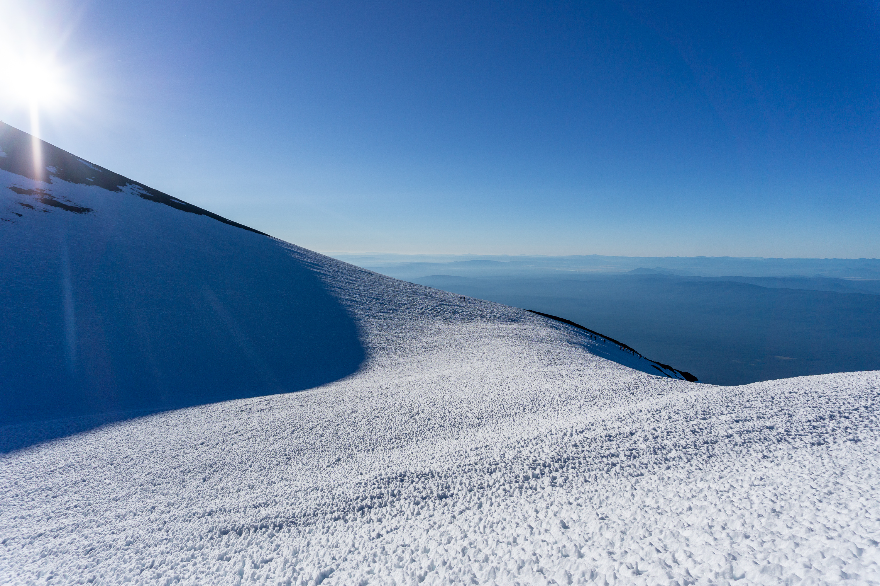 As we neared the top of the chute, with the snow at its toughest and the grade at its steepest, the morning wind picked up. Howling in our ears, it threatened to break our resolve. On the ridge, the windblown snow created a natural wall, where we escaped the wind for a moment and ate snacks. From here we could see the summit for the first time, and as we crossed the snowfield, the sun came up around the edge of Misery Hill.